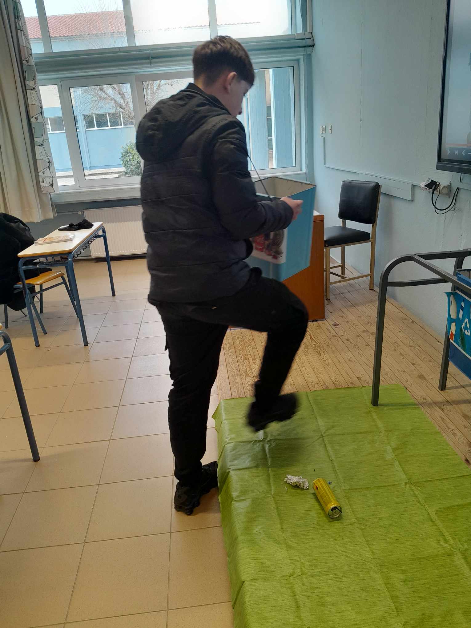 Στη συνεχεία κάναμε βιωματικό εργαστήριο, καθώς οι μαθητές χρησιμοποιούμε πολλά υλικά, όπως χαρτί, πλαστικό και αλουμίνιο, είναι σημαντικό να μάθουν να τα διαχωρίζουν και να τα ρίχνουν στους σωστούς κάδους – μια και στο σχολείο μας υπάρχουν κάδοι ανακύκλωσης στις αίθουσες, στους διαδρόμους και στην αυλή ακόμη και κάδος κομποστοποίησης – έτσι, συμβάλλουμε στη μείωση των απορριμμάτων και στη σωστή αξιοποίηση των υλικών.