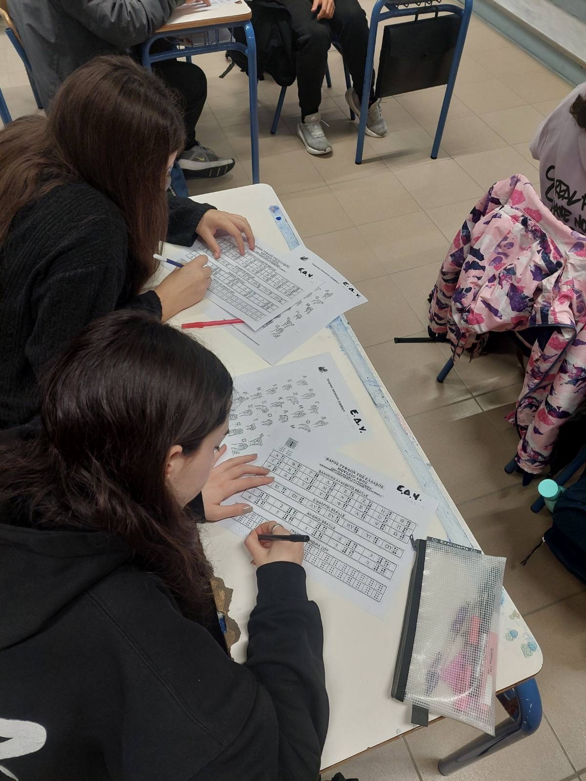 Με αφορμή την Παγκόσμια Ημέρα Ατόμων με Αναπηρία πραγματοποιήθηκαν στο σχολείο μας βιωματικές δράσεις από την Ε.Δ.Υ. του σχολείου ( κ. Τουρτούνη Δάφνη, κοινωνική λειτουργός και κ. Οικονόμου Βαλεντίνη, ψυχολόγος) με στόχο την ενημέρωση και την ευαισθητοποίηση των μαθητών σε ζητήματα ισότητας και αποδοχής της διαφορετικότητας. Επιπλέον, οι δράσεις επιλέχθηκαν με στόχο οι μαθητές να κατανοήσουν τι σημαίνει “αναπηρία” και να συζητήσουν για τις δυσκολίες που αντιμετωπίζουν τα άτομα με αναπηρία στην καθημερινή τους ζωή. Μέσα από προβολή βίντεο, βιωματικές δραστηριότητες, τη χρήση της νοηματικής γλώσσας και της γραφής Braille, αλλά και συζήτησης με όλους τους μαθητές δόθηκε ιδιαίτερη βαρύτητα στη σημασία της ισότητας, του σεβασμού και της συμπερίληψης στο σχολικό και κοινωνικό περιβάλλον. Μπορεί να είμαστε διαφορετικοί -άλλωστε, όλοι έχουμε και ικανότητες και δυσκολίες-, δεν παύουμε όμως να είμαστε ίσοι και να συμπληρώνει ο ένας τον άλλον!